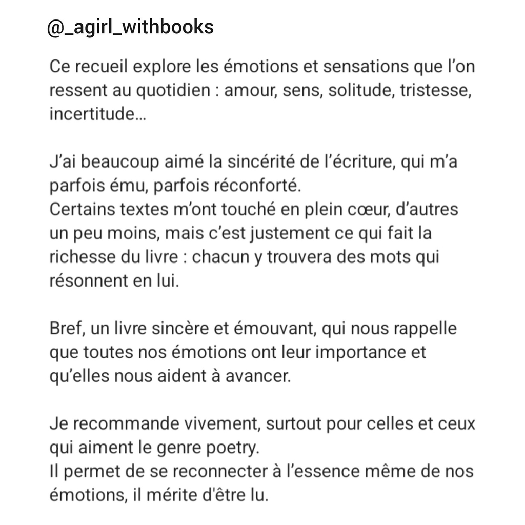 Plus d'une soixantaine de textes, exprimant des émotions et sensations qu'on peut rencontrer tous les jours (personnellement ou chez autrui) : l'amour, la solitude, l'incertitude, la tristesse...